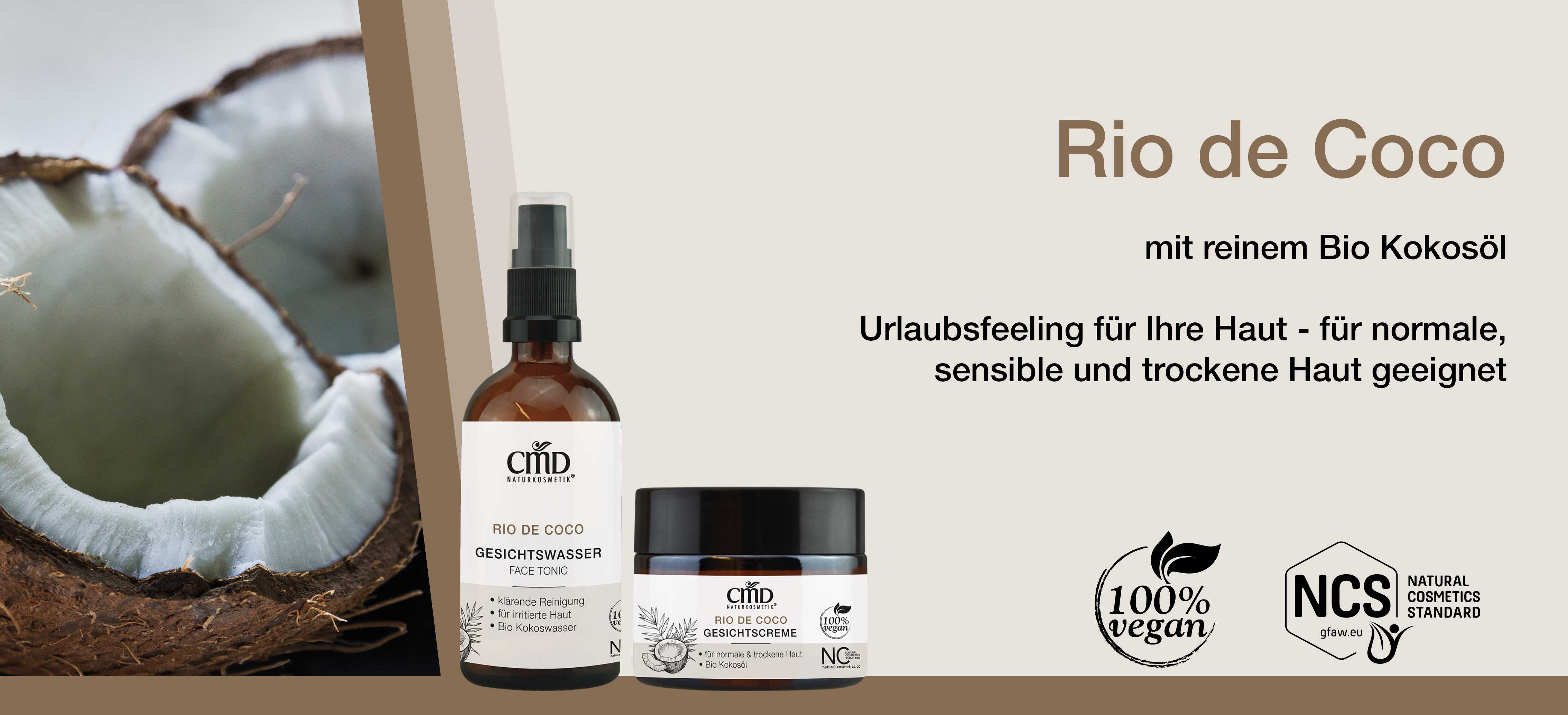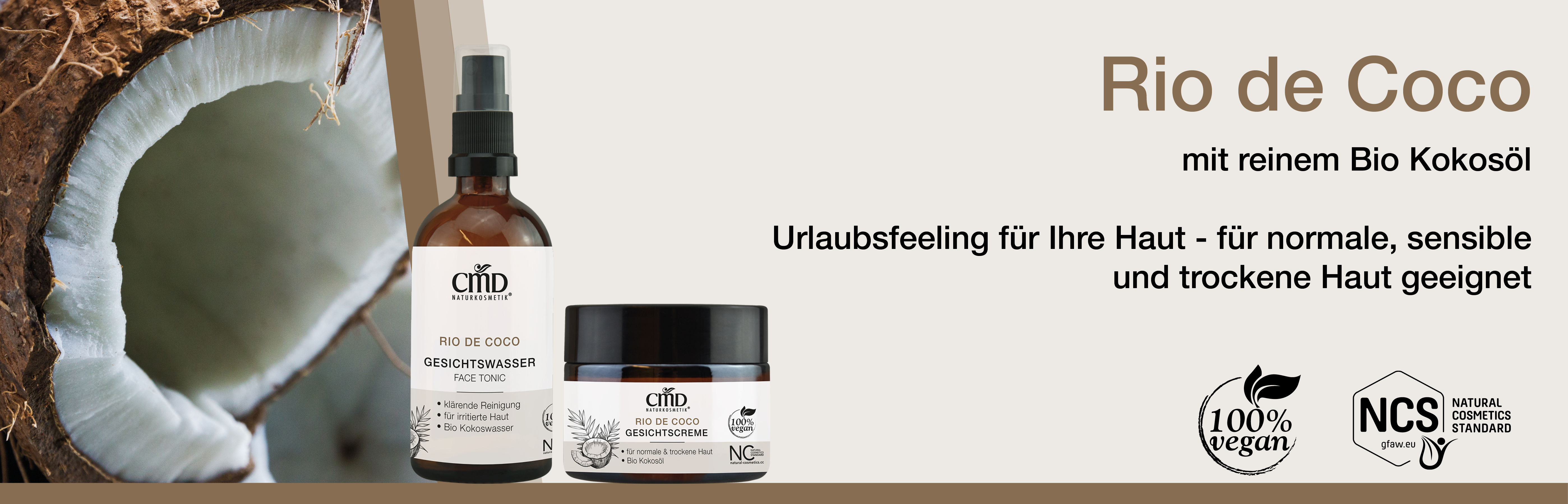 Die Rio de Coco Pflegeserie mit reinem Bio Kokosöl (Virgin Coconut Oil) eignet sich besonders zur Pflege von normaler, sensibler und trockener Haut. Auch schuppige, juckende oder irritierte Haut profitiert von den pflegenden Rezepturen. Diese Serie enthält nur wenige ausgewählte Inhaltsstoffe, um vor allem das Kokosöl als besonderen Rohstoff wirken zu lassen. Diese Pflegeserie ist 100% vegan und selbstverständlich ohne Mineralölrohstoffe, PEG`s und synthetische Emulgatoren.