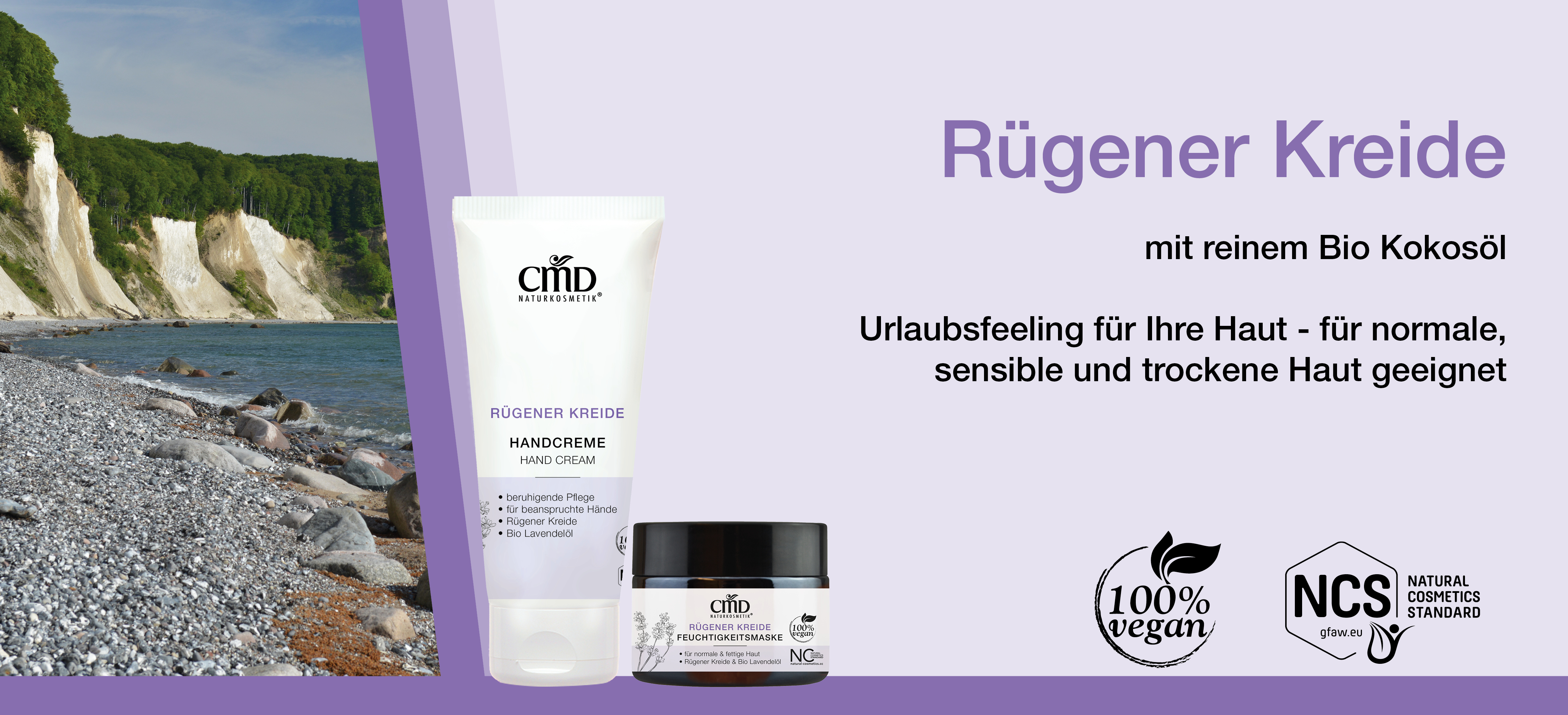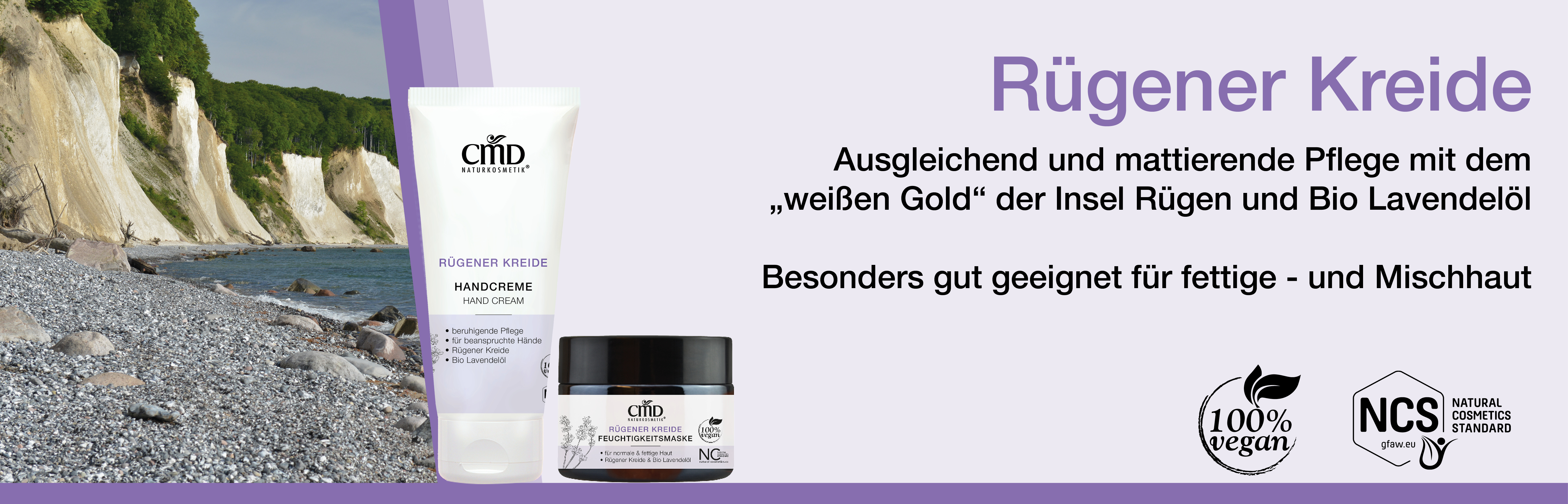 Die Rügener Kreide Pflegeserie eignet sich besonders gut für die Pflege von fettiger Haut und Mischhaut, denn Rügener Heilkreide wirkt auf die Haut mattierend und ausgleichend. Diese Serie enthält einen Hauch wertvolles Lavendelöl und hat einen hautberuhigenden Effekt. Veganer aufgepasst: Die Rügener Kreide Produkte sind zu 100% vegane Naturkosmetik ohne tierische Rohstoffe.